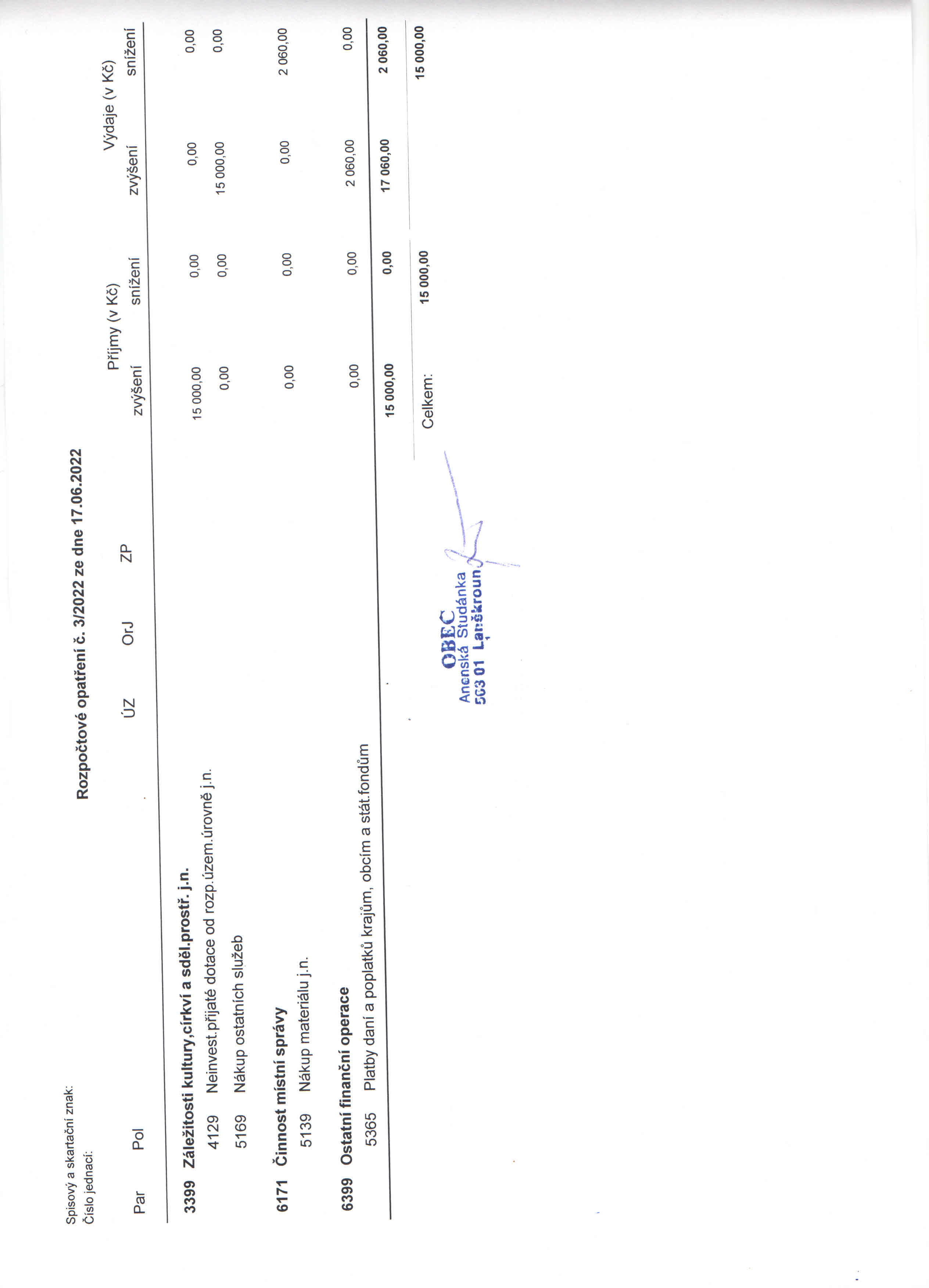 | Popis | Rozpočtové opatření č. 3/2022 ze dne 17.6.2022 |